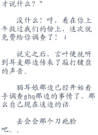 不过,言叶可是很负责人的告诉你,对于这样的傲娇猫系少女,如果你刚才真的直接吻下去了的呼,可以百分之百的打包票的告诉你,有百分之九十九的几率,傲娇会变为病娇。