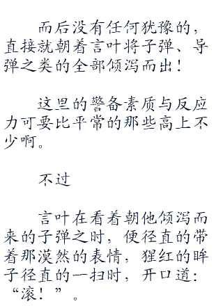“呜咦?!”在言叶捏住诗乃尾巴的瞬间,便见到诗乃仿佛全身炸毛的模样,在口中发出了让人微微一愣的声音之时,便只见到诗乃红着脸就转过头来,看着言叶:“你、你个魂淡!放、放手!”
