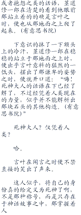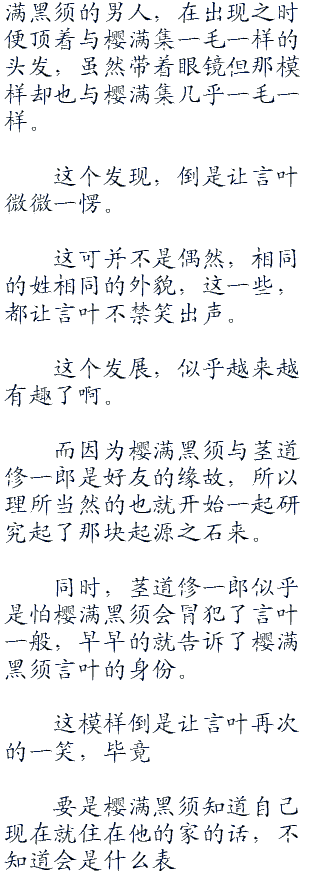 言叶虽然是在心中这样想,但是在看到爱丽丝菲尔径直的撇过头来看着他,并且还带着一脸和善的笑容,对着言叶说着呐,叶君你也觉得是这样不是吗?呼呼~的话语。