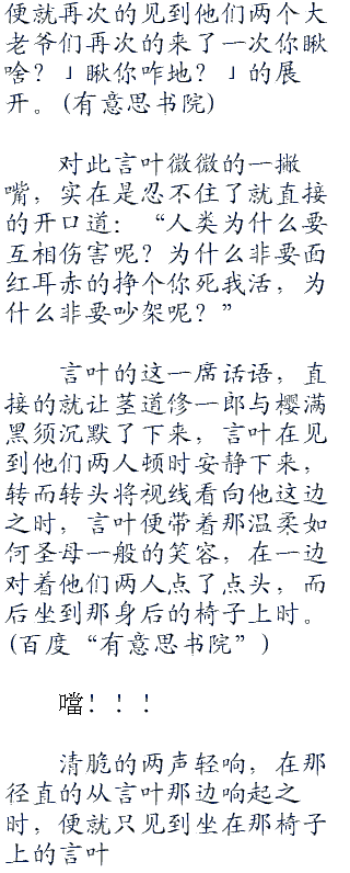 言叶在心中为卫宫切嗣沉重默哀了三秒钟之后,便径直的站起身,在拍了拍那手中挥动着那把巨大的杀猪刀的伊利雅的小脑袋之时,便笑着开口说道:“那么,去找卫宫切嗣吧。看 ▃ 毛 ▃ 线 ▃ 小 ▃ 说”
