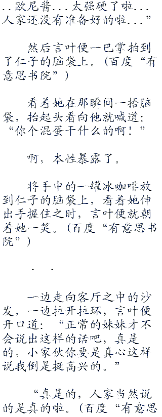 言叶在听闻c妈的话语,径直满意的点了点头之时,便抬起头,看向了那远处的b叔方向,而后,只见言叶在说着那么,继续吧。的话语之时,b叔便嗷!的一嗓子,再次的冲上了前来!
