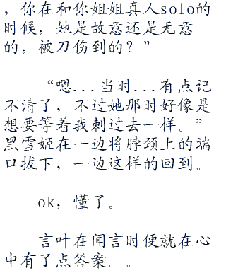 “欸?金鱼么?”女孩在听到言叶的话语之时,便径直的笑了起来,而后就在言叶以为他的计划会成功之时,他却只见到女孩直接的就将她腰间挂着的又黑又细的剑给拔出来之时,看着言叶笑着道:“那我可以把它切了么?”