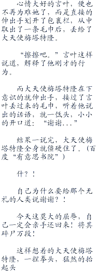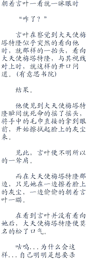 言叶便听到了那被他抱在怀中,安安静静的望着那远处的艾恩葛朗特,突然开口说着大哥哥...你说,上学...到底是什么感觉的啊...的话语,而后便再次的再次沉默了下来,就那样安安静静的看着远方。