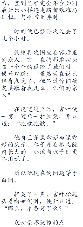 言叶在微微的一叹气之时,便反握其优纪的小手,就那样牵着她的手与她一同朝着那远处二十几人的方向走去。。