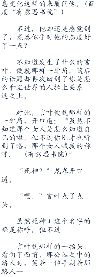 这些东西言叶说都可以说出一大堆的玩意来,所以去找樱满集,问他知不知道樱满真名的事情什么的...言叶表示我们能在校外说么?