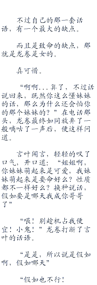 两人之间就这样沉浸了之下,直到言叶感觉到楪祈猛然的将他拥的更紧了之时,便只感觉到楪祈在他的耳旁低声道:“叶,为什么不去呢。”