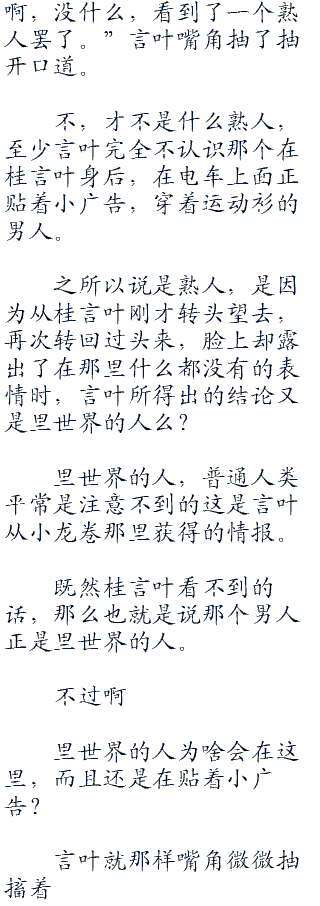 啊,不过说实话刚才其实都是言叶瞎编的,毕竟调戏傲娇而看她炸毛的样子实在是太过于有趣,特么是猫儿属性的。