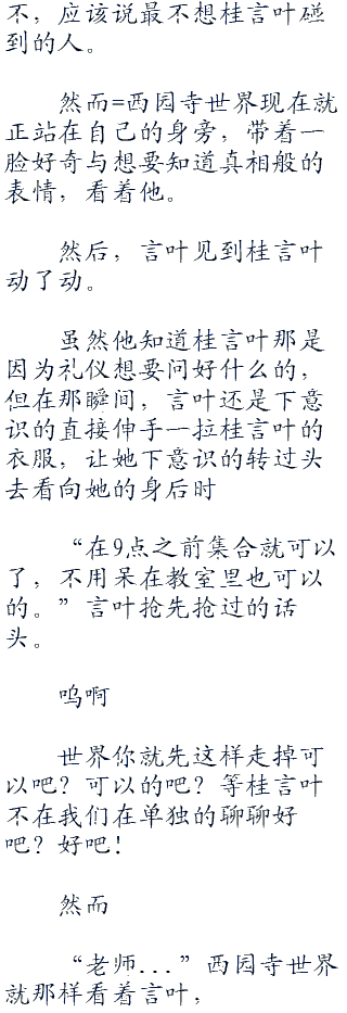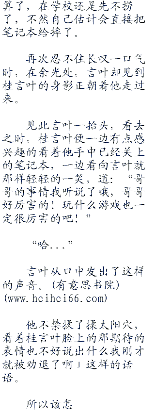 少女沉默了下来,但却依旧没有离开,而似乎是察觉到了这一点的言叶,在一脸疑惑的抬起头来再次看向面前的少女之时,开口道:“咋了?”
