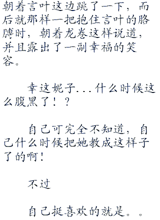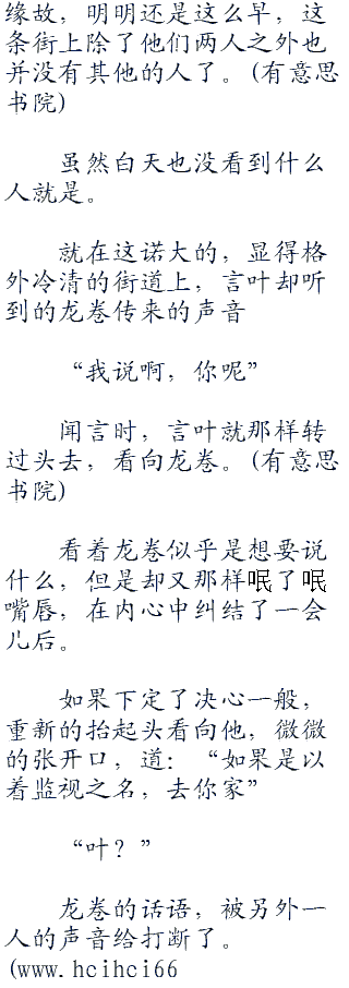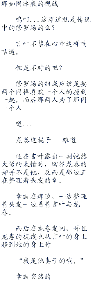 不知道在想着什么,鸫在疑惑的抬头看向言叶那消失的方向之时,便小声的自言自语道:“喜欢上他?自恋么那混蛋,我怎么可能...诶...等、等下...诶?诶诶诶?!我刚才都说了什么啊!?”