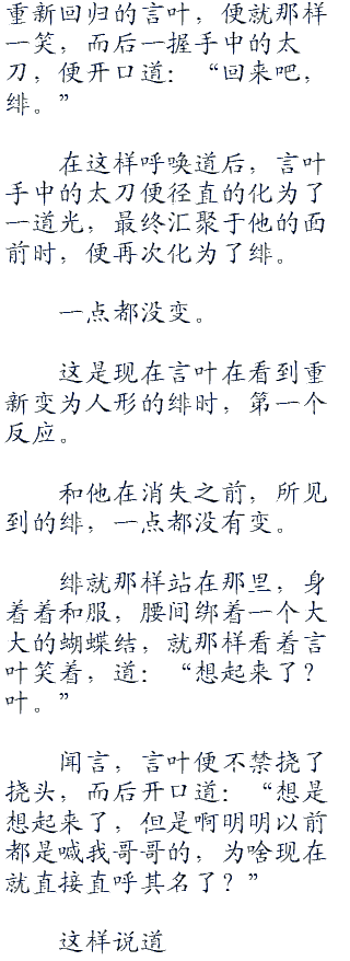 眼前之人并不是楪祈,虽然言叶现在没有任何的依据,甚至可以用这就是以前的楪祈这个理由来搪塞过去,但是,并不是。