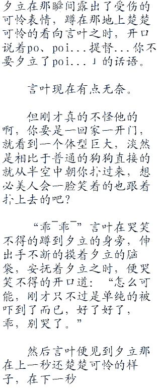 如果是在平常的话,言叶绝对会对那个突然出现的人抱着百分之两百的警戒心,但是——现在的情况则是里面站着一只可爱的萝莉,外面有一个黑着脸让自己赶紧解释那萝莉是怎么回事的黑雪姬。看◎毛◎线◎小◎说