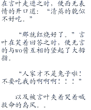 最后一人的话语还没有说完便瞬间断绝了,只因为在他刚想开口时,言叶便已经跑到了他的面前,伸出手,抓住领,往后一丢。