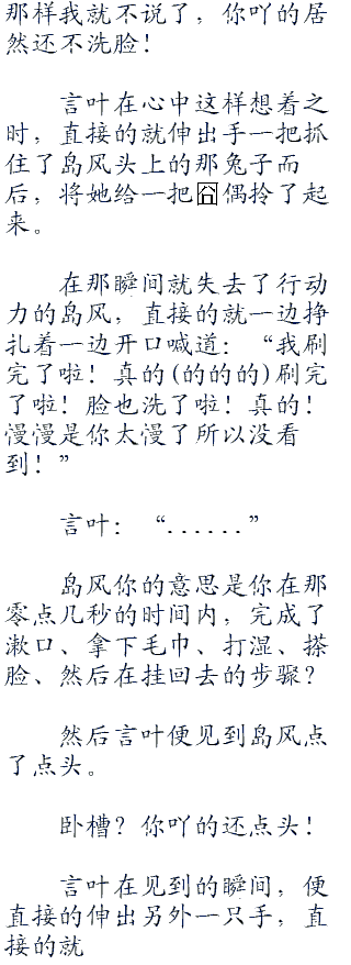 【自己呢,没有她们漂亮也没有她们强大,自己唯一能够做的只是在后面默默的看着叶罢了,这让我很讨厌自己。】