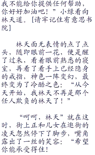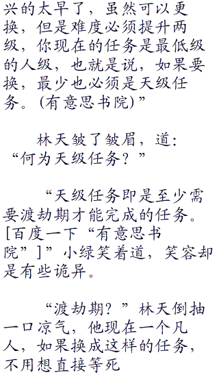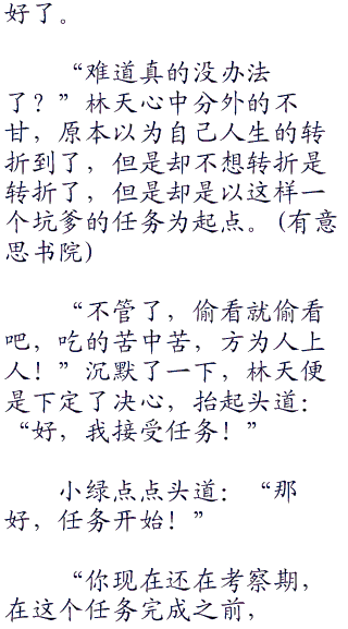 小绿道:“不会错的,你的任务就是这个,你的运气很好,这个任务属于最简单的任务,任何一个普通人只要花一点精力都能完成!”