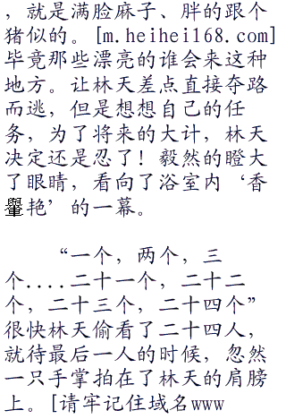 于是林天便是直奔海天市的一所温泉洗浴中心,偷偷的溜进了女浴室中,一眼看去,浴室中足足有二三十人,让林天大喜,这下可以完成任务了,不过接下来,林天的笑容就僵住了。