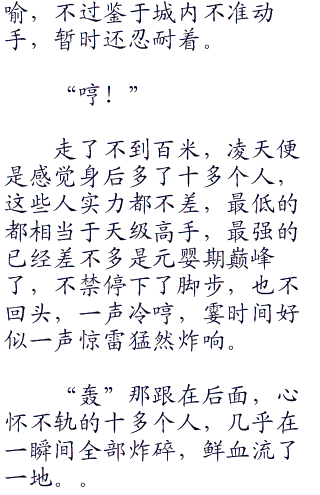 “去吧”凌天没有理会,而是看向了几女道,老者有天级后期的实力,而众女中最强的慕容雪也才地级初期,其余五人才人级巅峰,但是凌天七人联手,还是能够打败这个老者的,毕竟众女修炼的功法可是比那老者强太多太多了,哪怕现在根本发挥不出多少实力,也不是他一个小小的吸血鬼能对抗的。