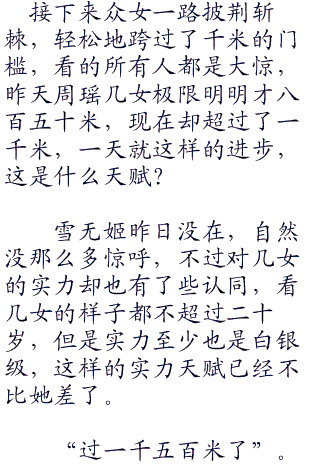 不过周瑶、杨诗杨雪、秦珂和南宫婉儿的速度却是降了下来,已经快要到极限了,而慕容雪却还保持着之前的速度,看那样子冲破一千米没有丝毫的问题。