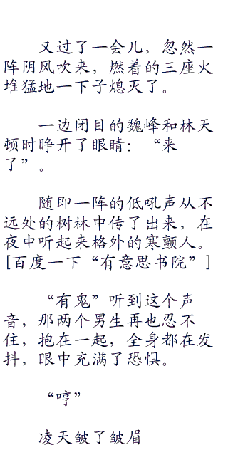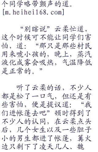 随即众人不由得朝着四周看去,只见那薄薄的雾气,在白日看起来甚是美丽,但在这时却是格外的阴森恐怖,吓得那些男同学心地都是有些打颤。