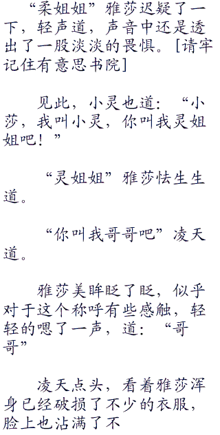 “不用怕,我们不是坏人”小柔道:“有我们在,没人敢欺负你的!”说着将雅莎拉了起来,在一边坐了下来。