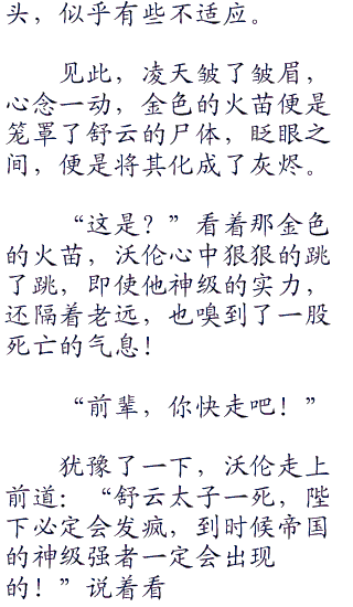 而与此同时,在外面一直关注着藏书阁的沃伦也是被这一幕弄得一愣,待看清了死去的那青年时,脸色顿时一变:“舒云”,着舒云可不是一般人,乃是当今雷云帝国皇帝的儿子!