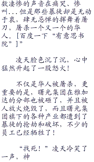凌天皱了皱眉,神念瞬间笼罩了整个地球,雅加达的一切情况都清晰的呈现在了他的脑海中,只见此时,雅加达市中心无数的商店被砸毁,不少的华人倒在了血泊中,无