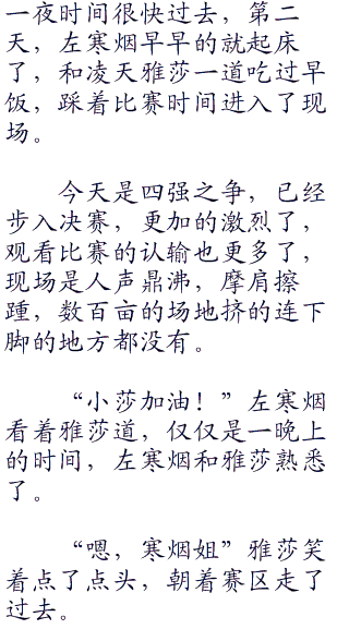 一天的比赛落下了帷幕,回到别墅内,凌天看着雅莎道:“小莎,好好熟练一下我教你的技能,不然明天要战胜你的对手可没那么容易!”