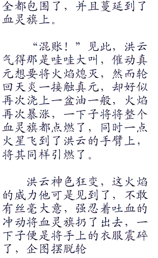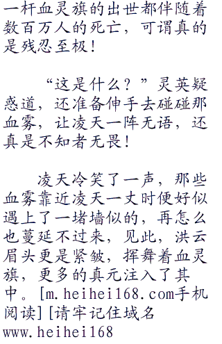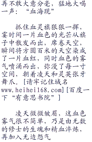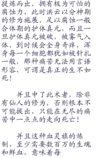 “哼”闻言,洪云大怒,心中的火气上涌再也忍不下去了,一招手一面旗子就出现在了手上,冷笑道:“就饶你尝尝血灵旗的厉害!”说完,真元注入旗子中,霎时间旗子猛然暴涨了数十倍,化作了一面黑色的大旗。