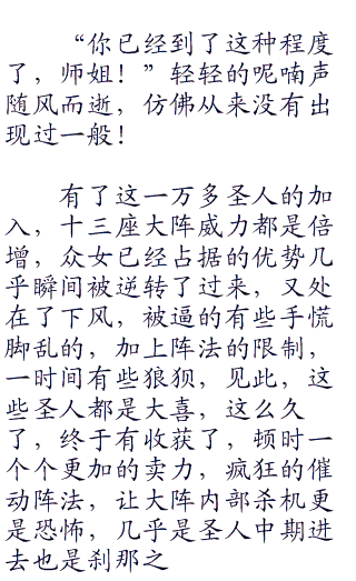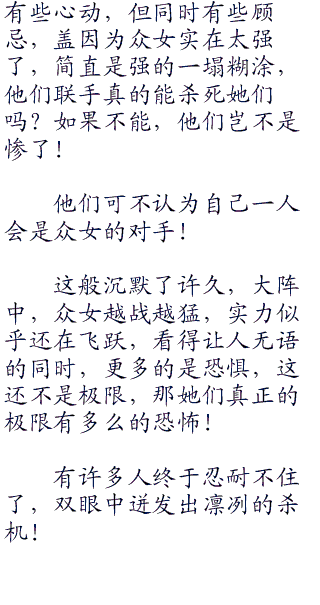 同时在强大的高压压迫下,众女的实力也在不断的提升,渐渐的众女腾出了手,十三人只需要六个人防守,剩下的则在一边警惕,每隔一段时间就换人;如此持续了一段时间后,换成了三人一组;再到两人一组...