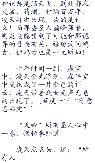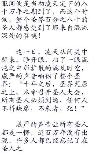 终于又过去了十多万年,圣界一个高阶圣人感受到了来自混沌深处的召唤,没隔多久,越来越多的高阶圣人感受到了召唤,这时,这个消息再也瞒不住了,很快传遍了整个圣界,让所有圣人都是疑惑不已!