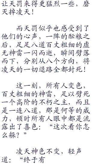 “轰轰”一阵轰隆声之中,雷云之中一道足足有一丈粗细的紫色闪电劈落而下,毁灭的气息散开,比之之前的那一道足足强大了数倍。