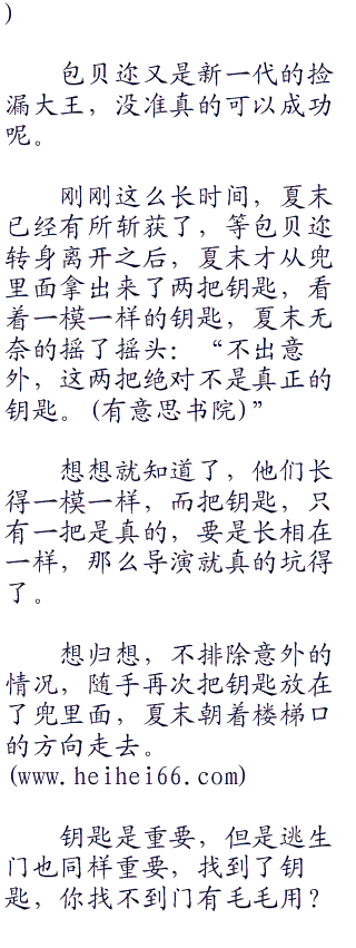 拍了拍包贝迩的肩膀,夏末悠哉的说道:“现在不要想这些,就算是有内奸,现在也在里面管着呢,你还是去寻找钥匙吧,要真的是运气爆棚的话,没准我们直接就赢了呢。”