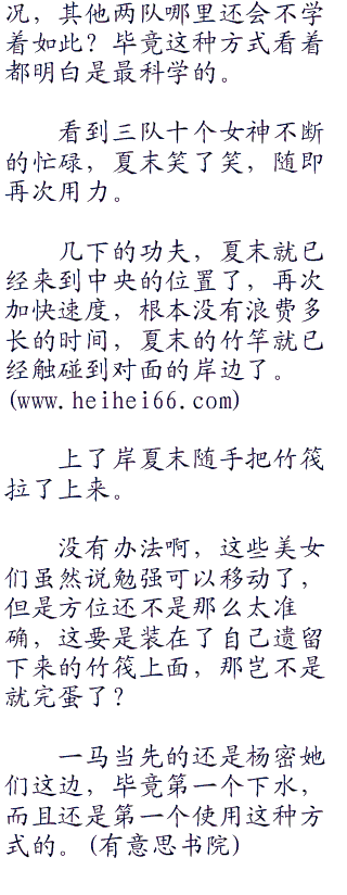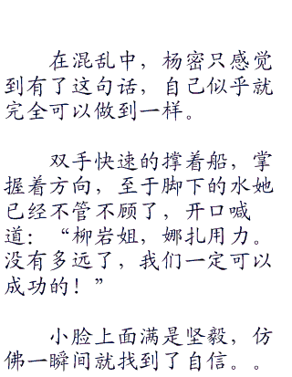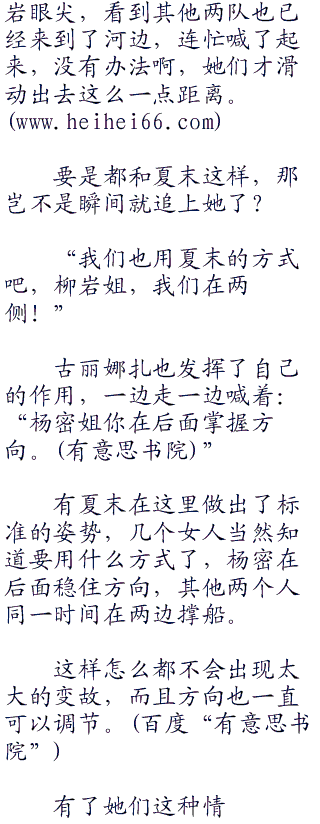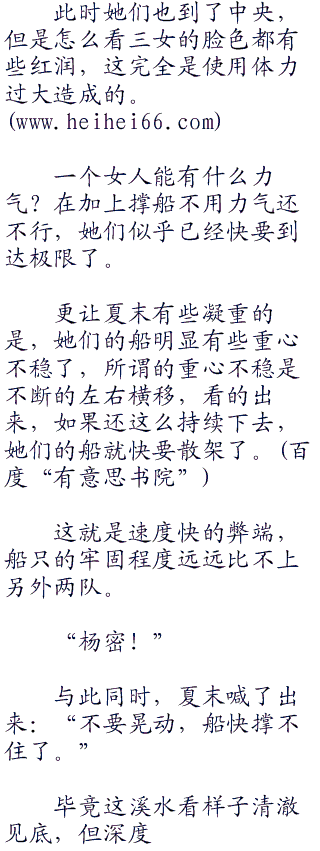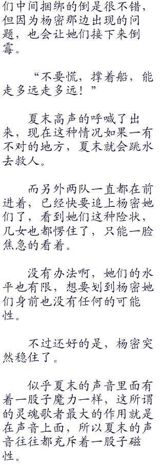 而夏末的旁边就是杨密她们这艘船了,三个妞费了好半天的力气才划动出来一点,而且明显方向是不对的。
