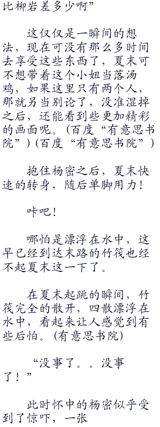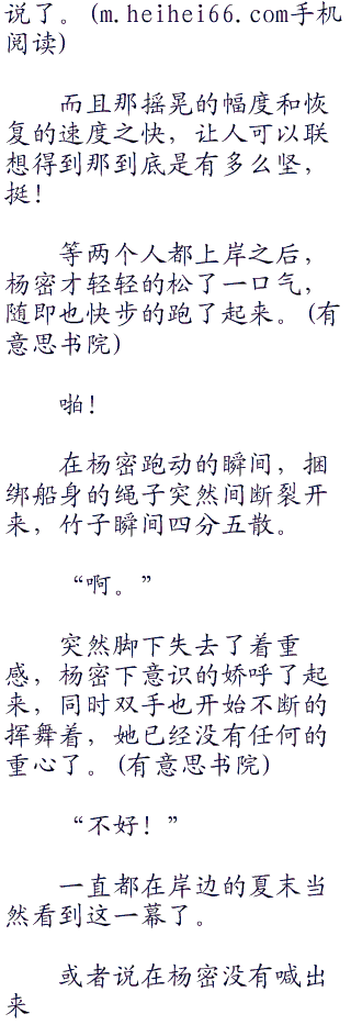 岸边的夏末也看到了,杨密脚下的竹子已经快要完全的分裂了,那绳子已经松散到了一定程度,而杨密的鞋子早已经被水浸泡了。