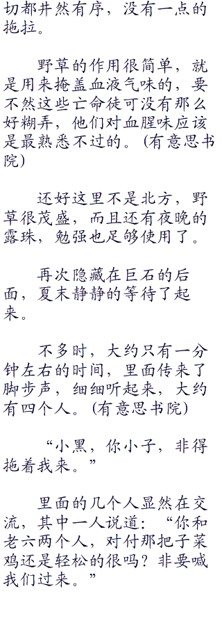 而石头的附近,则是密密麻麻的野草,而刚刚说话的那个人正在巨石的后面,如果不是仔细观察的话,很难看到他的人,或者说是他的脚。