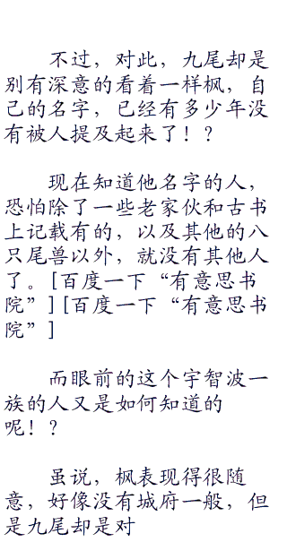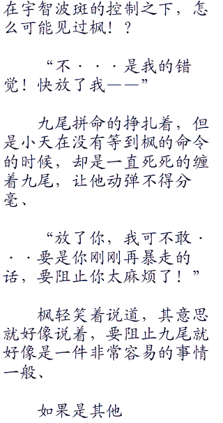 枫轻轻的摸了摸小天的脑袋,示意让他安静了下来、然后抬起头来,看着九尾,有些无奈的摇了摇头。