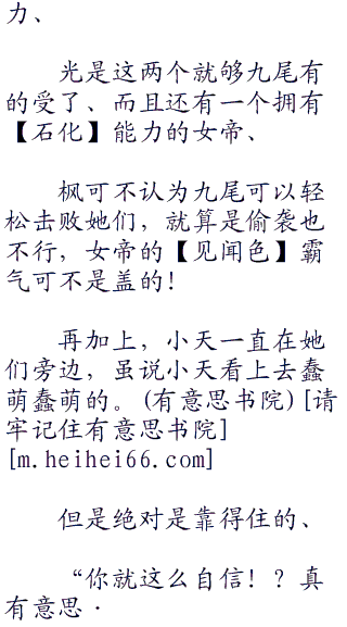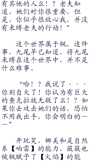 枫不屑一顾的瞥了24一眼九尾,这家伙还真自大!