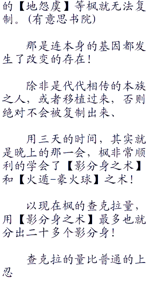 所以,最后,枫兑换了一个【b】级的影分身之术和【c】级别的【火遁-豪火球之术】!