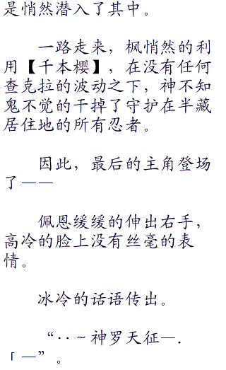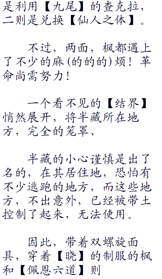 不出枫的所料,在这三天之中,枫果然是发现了有【晓】的成员跟在他的背后监视自己。