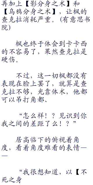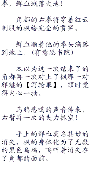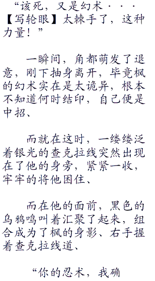 以极快的速度逼近枫,但是枫仍然没有任何的反击,只是躲避其攻击,可是,其【写轮眼】却是一刻不停的在工作着、