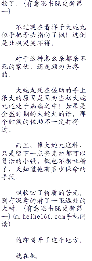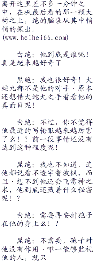 而这时,大蛇丸已经发现,最开始枫投掷出的射在大树上的苦无已经消失不见。
