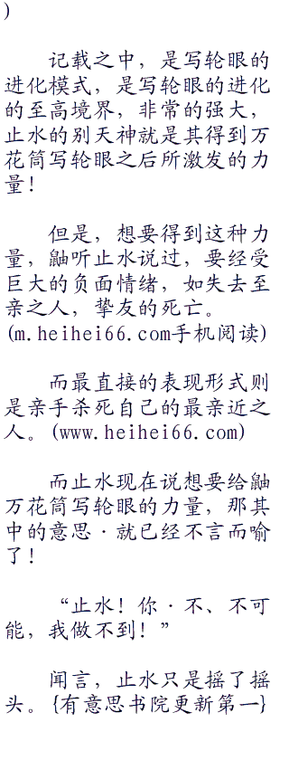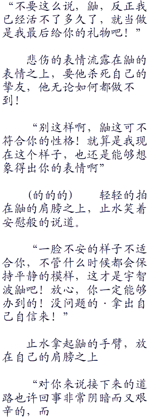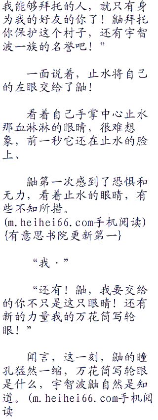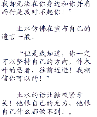 鼬静静的听着止水的话,不自觉的,拳头紧握了起来。
