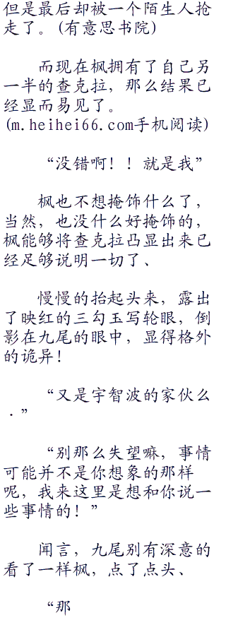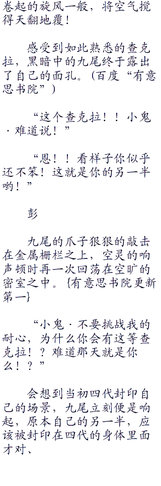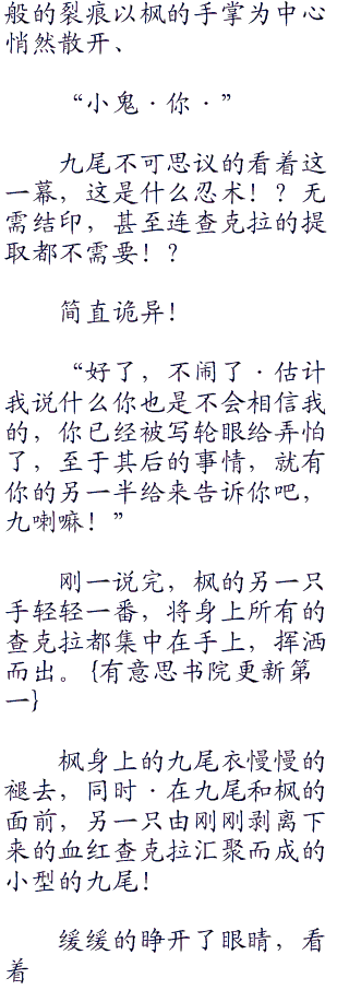 枫朝着九尾打了打招呼!身上的血红查克拉,因为看见九尾的缘故,似乎变得沸腾了起来。