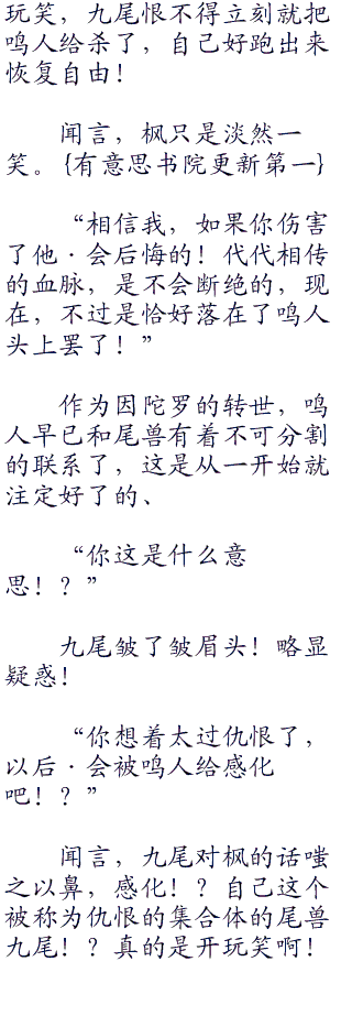 九尾皱了皱眉头,不为难他!?这怎么可能,如果不是身为人柱力的他,自己如何会被束缚在这里!?