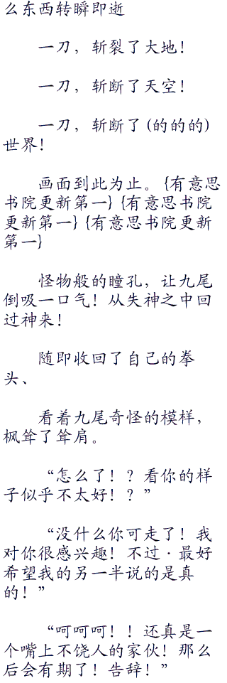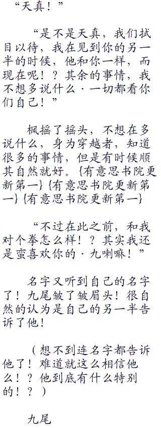 当然,这时候枫根本不知道他们在干些什么,和九尾度过了这么久,他也还算是了解!