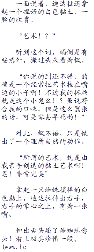 “这你放心,蝎老兄!!他很符合你的胃口,是一个整天把艺术艺术挂在嘴边的家伙!”