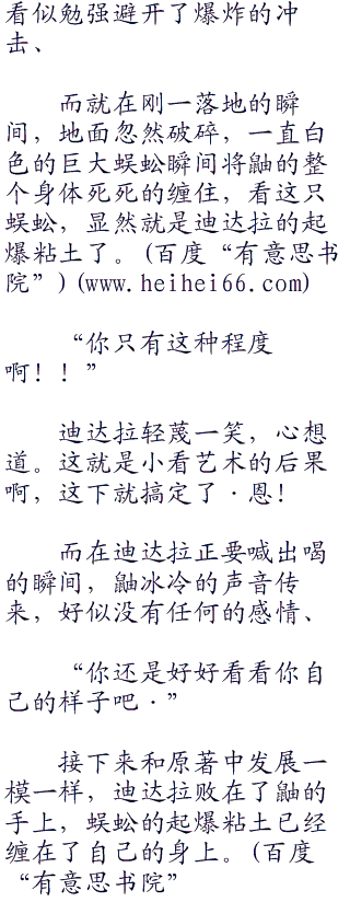 这一点,枫无法否认,能够将艺术做到这一步,小迪的确非比寻常,殊不知数年后的小迪为了证明其艺术,搞出了一个攻击力堪比十尾尾兽玉的超级爆炸!