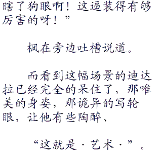 “这简练的线条,追求平面效果的造型,恩!这就是艺术,不过,我的艺术并不仅限于此,我的作品能动,空有架子的话,那只是摆设,恩!”