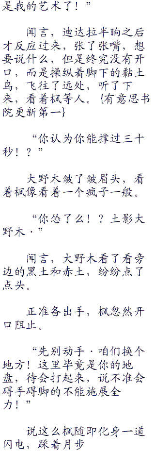 枫的话依旧非常的平静!平静得让背后的迪达拉都觉得不可思议。