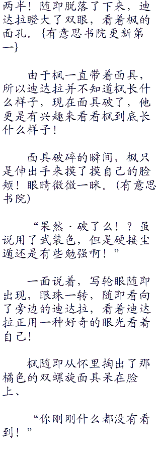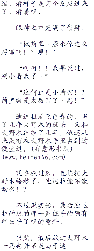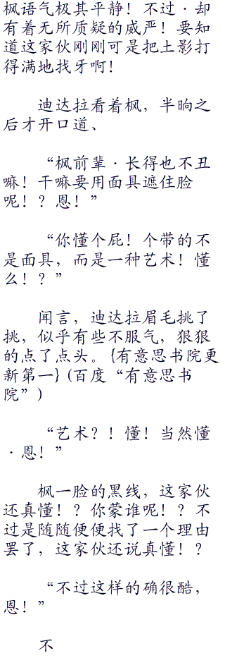 枫连忙拍了拍迪达拉的脸,这才让迪达拉从刚刚的状况之中缓过神来!看着枫,张了张嘴、