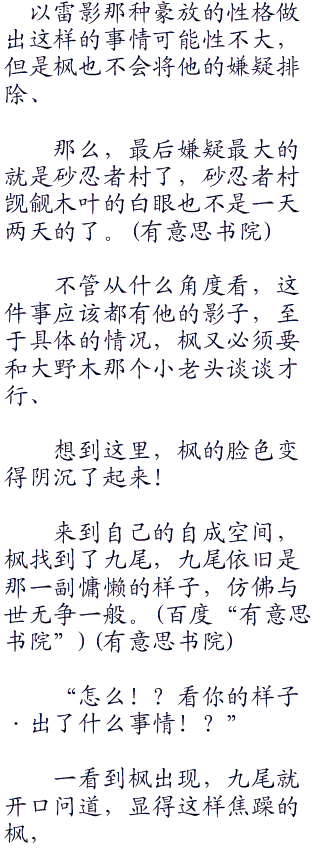 首先,枫就排除了水之国的雾隐村,因为枫知道,四代水影刚被带土给搞定,现在估计冥照美才上任水影没多长时间!